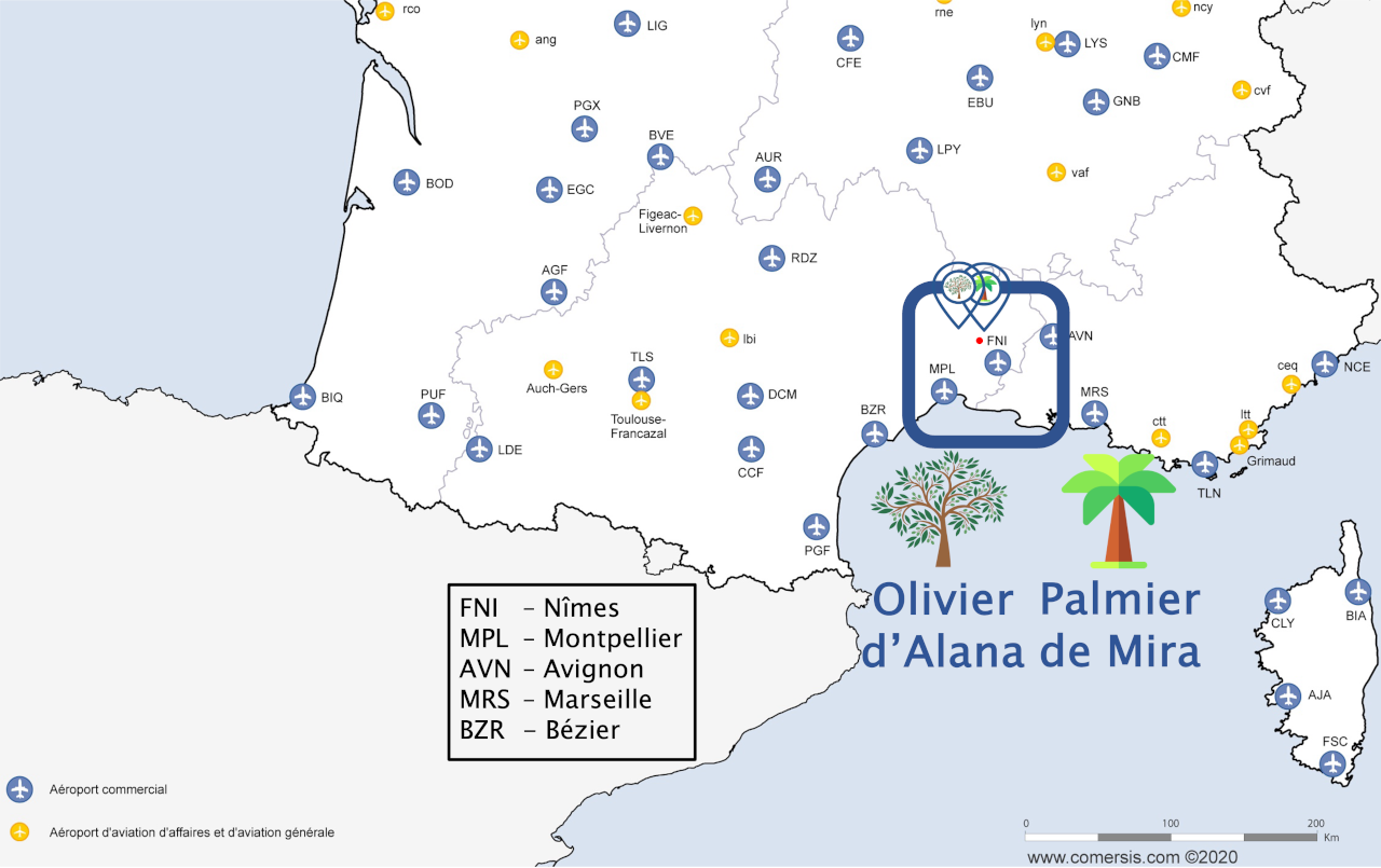 Certains aéroports plus grands tels que Marseille restent à une distance acceptable et il est aussi possible de rejoindre le gîte ensuite en utilisant le train et les transports en communs ou bien en louant une voiture (à l'aéroport ou bien à la gare SNCF ensuite à la fin de votre trajet de transfert à Nîmes ou en Avignon). Il est aussi possible de vous organiser un taxi, voire une navette selon les disponibilités.